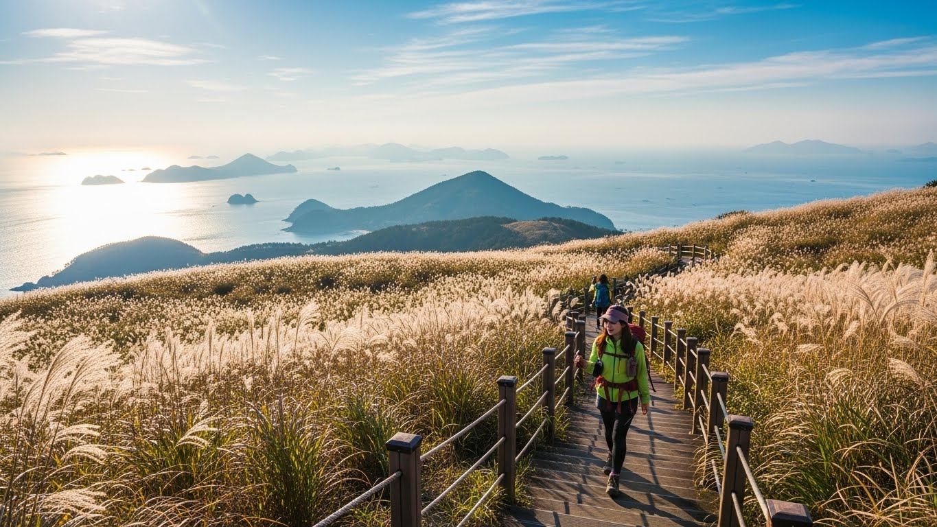 이곳의 가장 큰 매력은 뭐니 뭐니 해도 산과 바다를 한눈에 담을 수 있다는 점이에요. 날씨가 맑은 날에는 정상에서 서해의 올망졸망한 섬들과 반짝이는 윤슬까지 감상할 수 있거든요. 억새밭 사이로 난 데크길을 걷다 보면 마치 영화 속 주인공이 된 듯한 기분을 느낄 수 있을 거예요. 해 질 녘 노을과 어우러진 억새의 금빛 물결은 그야말로 황홀경 그 자체랍니다.